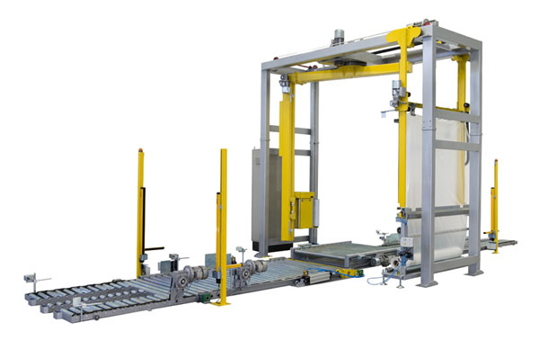 5、在線式薄膜纏繞機,以拉伸膜為包裝材料應用與托盤或棧板,通過輸送線連接。