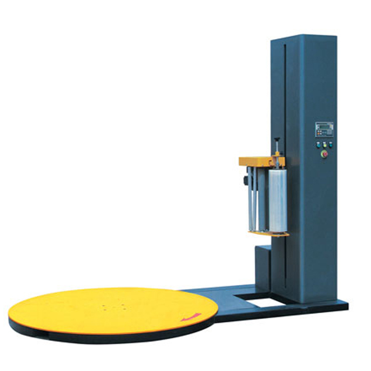 人工控制纏繞過程。包裝速度低。卷輥滑架速度、轉盤/旋臂轉速、卷繞為大小不能調整。由人工操作控制薄膜的裹膜的重疊量、翻邊量、纏繞層數(shù)和貨物裹膜高度。不能與生產(chǎn)線連接。
