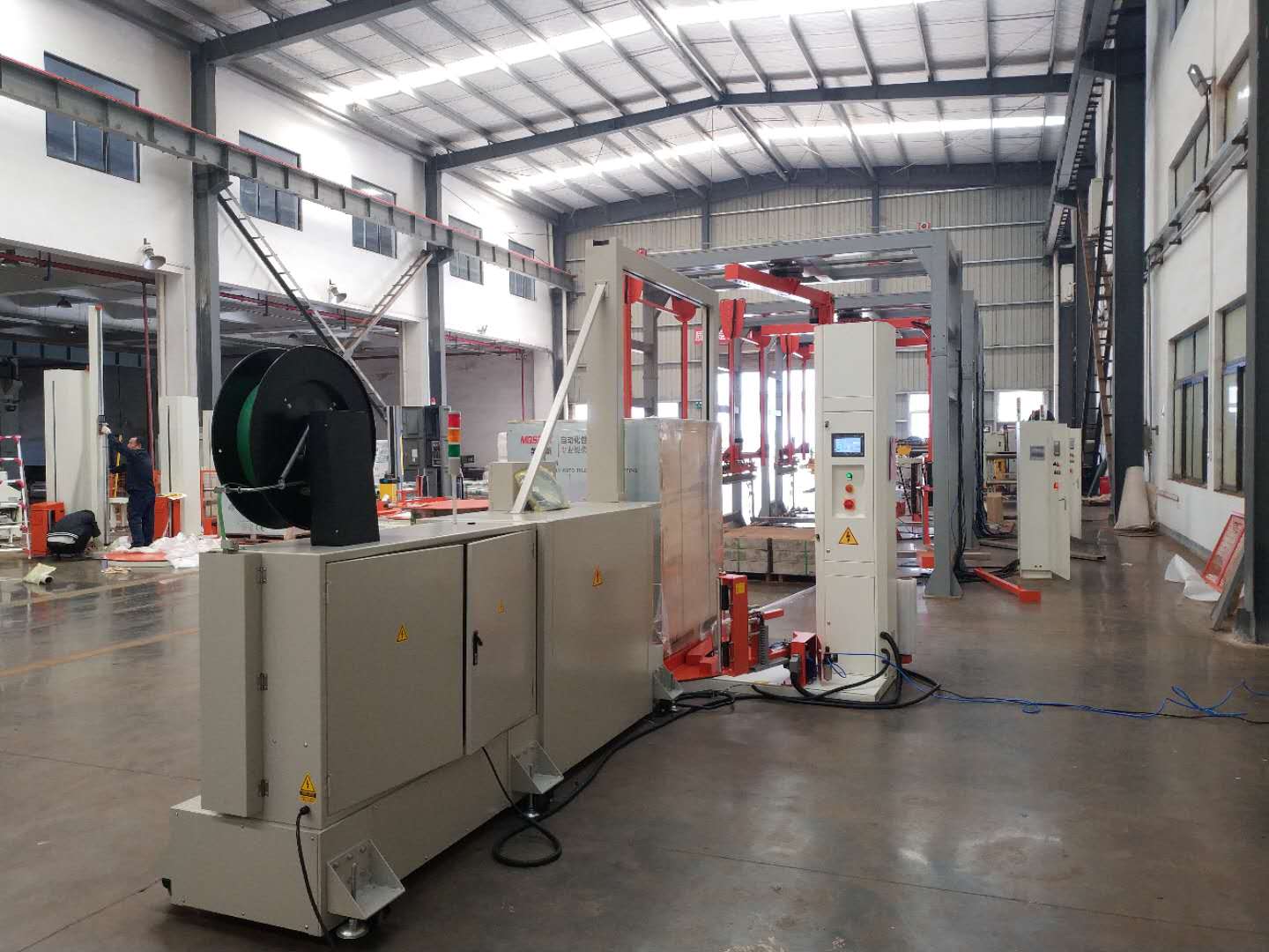 將托盤貨物放到纏繞機圓盤上后,按啟動鍵進行全自動打包(縱橫2條行程井字形,共計4)打包好后進行托盤纏繞,自動纏繞包裝好后會有報警提示音人工用叉車下貨入庫完成整個流程。